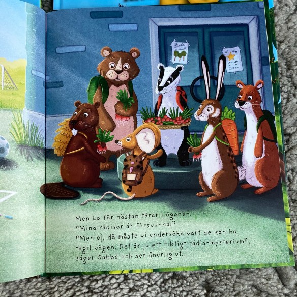 Det här är mysiga och lärorika böcker med både saga och fakta och med fina illustrationer. I Odla med Lo fastnade sonens blick på de olika djurens ryggsäckar. Den sidan fick vi stanna vid en stund för att titta, peka och prata. Bild 3 här i bildspelet.