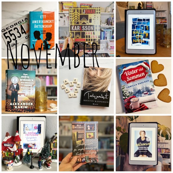 I november blev det 9st böcker och det var lite färre än jag hoppats och tänkt. Jag har egentligen inga läsmål men förra månaden kom jag på att det vore kul att nå 100 lästa böcker i år igen. Det var några år sedan sist. Men efter november är jag uppe i 88 och jag vet inte om jag klarar att pressa 12 st i december. För en del är det småpotatis, men jag har andra intressen jag gärna vill hinna med. Ja, och kanske umgås lite med min familj. Det är ju jul och så. 😉